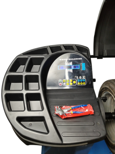 Балансировочный станок, выносной дисплей, автоматическое измерение диаметра и вылета, автостоп колеса для установки грузика, подсветка места установки,   диаметр диска Ø 12-24", ширина диска 1,5-12", вес колеса до 65кг., мотор 220V/0,257 kWt, точность балансировки + 1г.