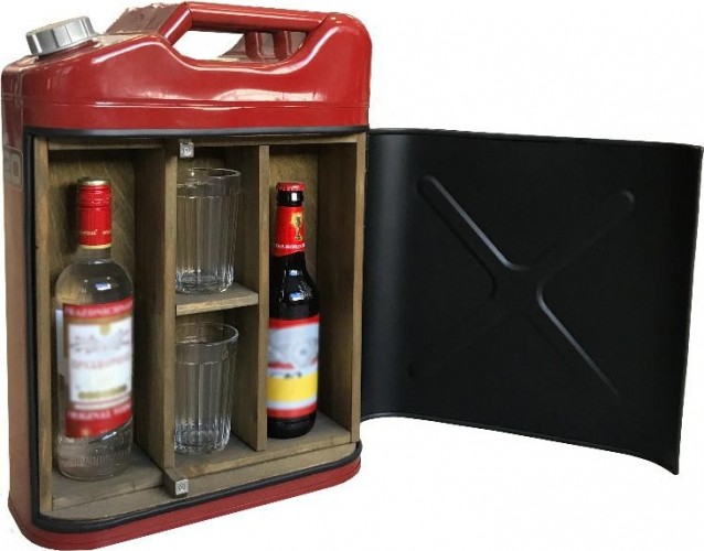 Мини-бар изготовлен из настоящей стальной канистры. Отсек для хранения крепких напитков выполнен из тёмного дерева с благородной фактурой. В баре-канистре имеются два больших отделения для бутылок и три отделения поменьше для стаканов и закусок: минимум, необходимый для тёплого дружеского застолья.