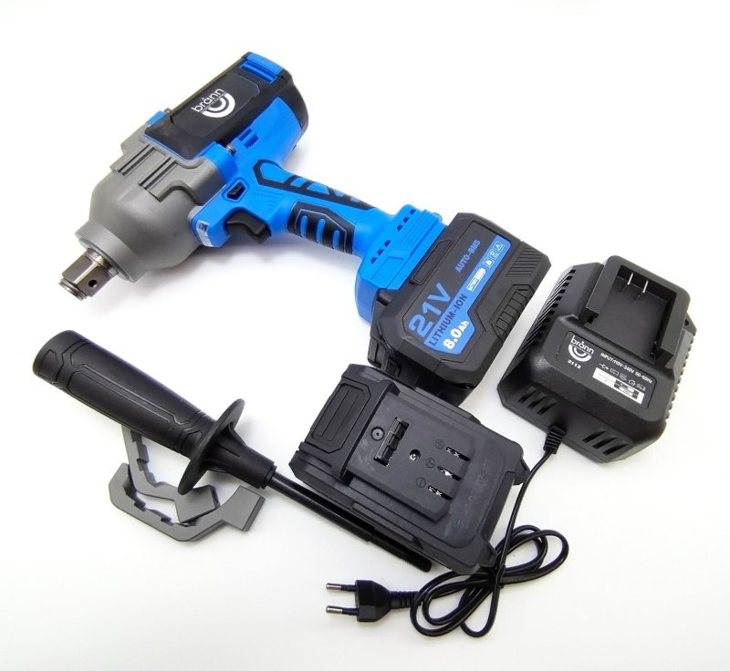 Мощный ударный аккумуляторный гайковерт BRANN для закручивания и откручивания болтов и гаек, с максимальным крутящим моментом 1800 Нм. Присоединительный квадрат 3/4.” Поставляется в кейсе, с зарядным устройством и двумя аккумуляторами.