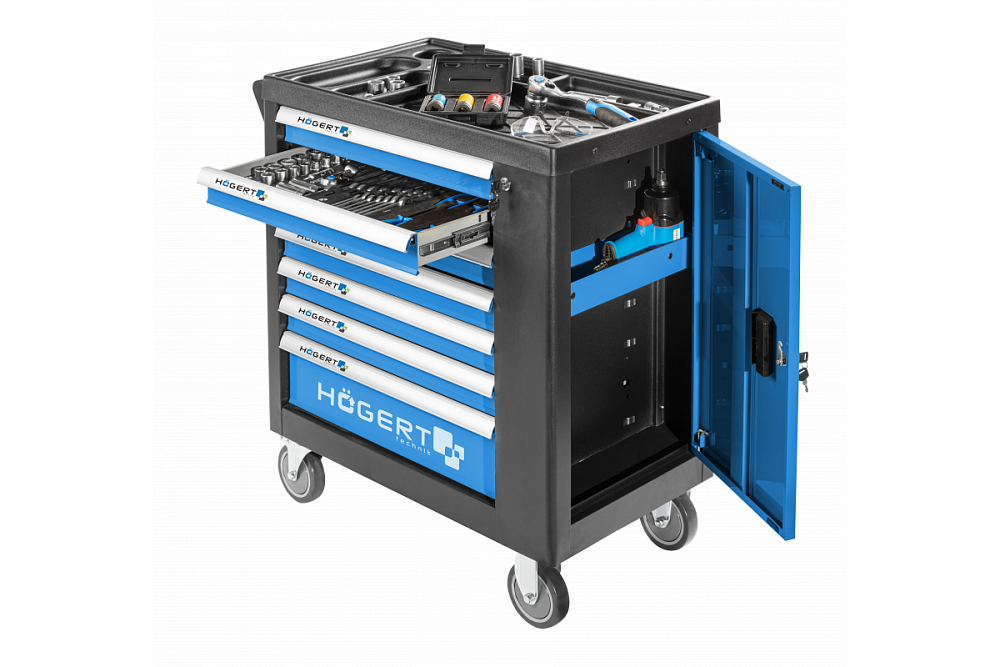 HOEGERT TECHNIK HT7G049 профессиональная инструментальная тележка, разработанная для эффективной организации и хранения инструментов в авторемонтных мастерских, гаражах и других рабочих пространствах. Прочная конструкция, 7 выдвижных ящиков различной глубины и удобный боковой отсек делают эту тележку незаменимым помощником для любого мастера.