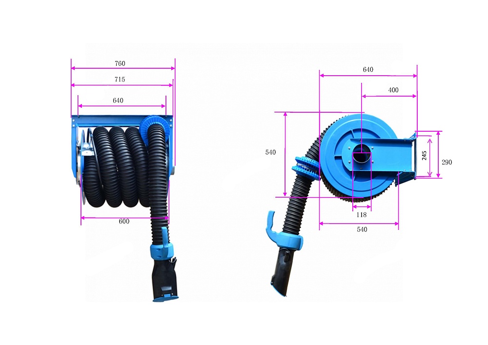 Катушка со шлангом для удаления выхлопных газов (шланг 8,0м. х Ø76 мм)   Механическая пружина возврата шланга. Комплект поставки: шланг из термостойкого армированного эластомера (TPE)., резиновое газоприемное сопло с рукояткой, стопор, салазки для крепления.