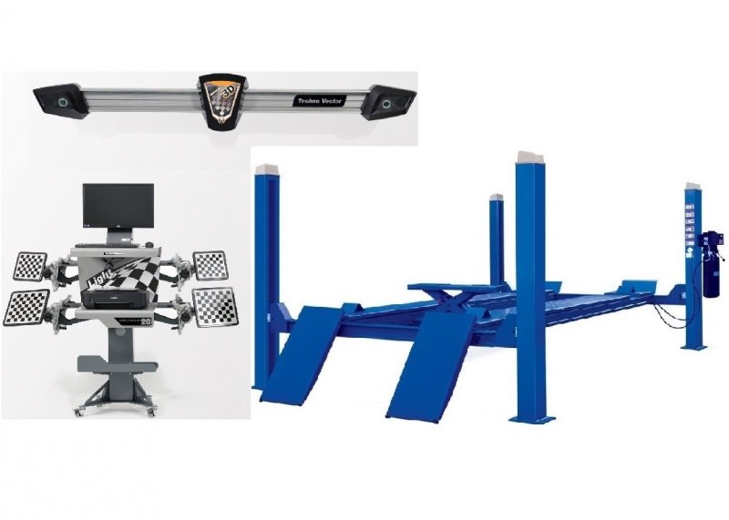 Комплект четырехстоечный подъемник для сход-развала ВСЕХ авто. Длина платформ 4850 мм. Для всех типов стендов сход-развал в т.ч 3D и 3D с прокаткой, между колоннами 2910 мм. Подъём 1800 мм. Г/П-4,0 т. В комплекте: Немецкий насос «Bucher hydraulics». Гарантия 2 года + траверса 2т. + анкерные болты 16шт. + противооткатные ограничители 2шт. + противооткатные упоры 2шт.  + Двухкамерный стенд сход развал 3D Техновектор 7202 К 5 А Серия PRO. Настенный. Применяемость: Яма или подъемник. В комплекте: круги поворотные.