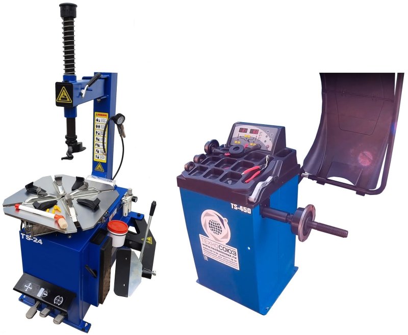 Комплект TS-24 Станок шиномонтажный. Полуавтоматический. Квадратный стол. Для дисков: внешний 12÷22”, внутренний 11÷24”.  Усилие отрыва покрышки 2700 кг. В комплекте: пистолет для подкачки шин + монтажка + пластиковые накладки на зажимные кулачки + регулятор давления с влагоотделителем и манометром. + TS-450 Балансировочный станок (без лазера) Для дисков: 10–24” (256÷610 мм). В комплекте: кожух с автозапуском + клещи + кронциркуль + быстрозажимная гайка + набор конусов.