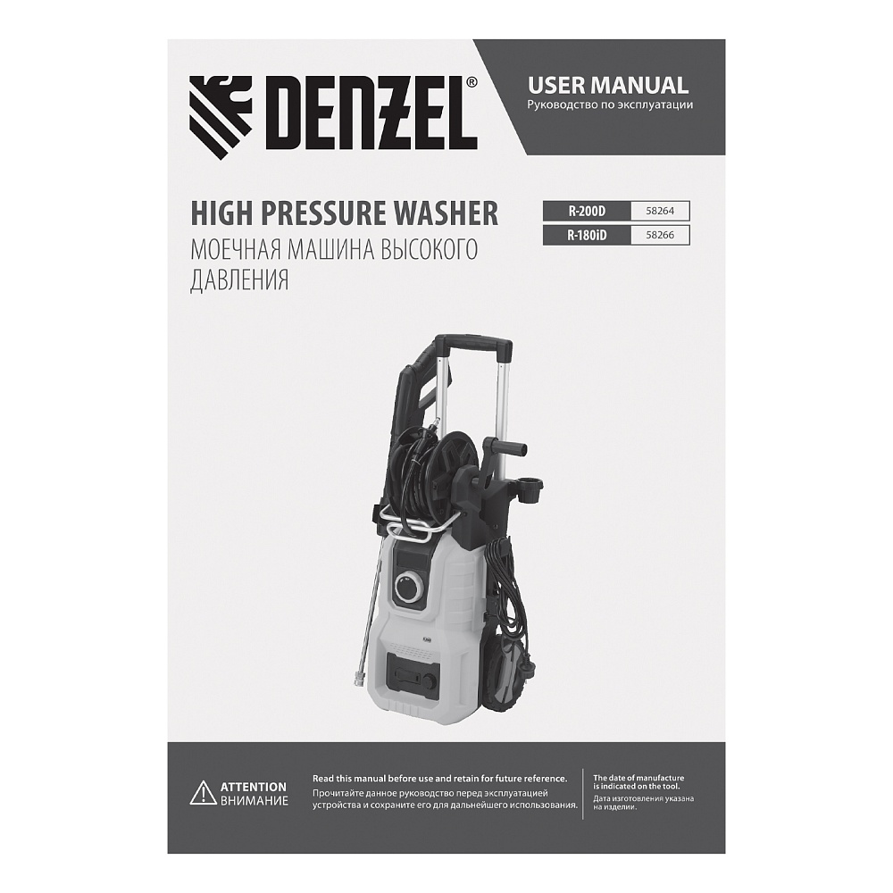 <p>Моечная машина высокого давления Denzel R-180iD 58266 мощностью 2000 Вт, с барабаном и асинхронным двигателем, используется для мытья дорожек, тротуаров, фасадов зданий, автомобилей, окон, садовой мебели и инвентаря. Максимальное давление составляет 180 бар, производительность — 420 л/ч. Мойка подключается к водопроводной сети, а в случае ее отсутствия может забирать воду из любого открытого резервуара, работая в режиме самовсасывания. Надежная алюминиевая помпа со стальными плунжерами обеспечивает стабильное давление даже при длительном интенсивном использовании. Мойка высокого давления незаменима на дачном участке.</p><h2>Преимущества</h2><ul><li>Надежность — асинхронный двигатель устойчив к нагрузкам и не требует сложного обслуживания.</li><li>Максимально эффективное очищение — к мойке прилагается внешний пенокомплект с функцией улучшенного пенообразования, быстросъемное крепление позволяет устанавливать его на пистолет одним движением.</li><li>Выбор оптимального угла распыления — машина поставляется с 3 насадками: 0°, 25° и 40°.</li><li>Быстрая подготовка к работе — быстросъемный адаптер упрощает подключение шланга подачи воды.</li><li>Качественная фильтрация — посторонние частицы задерживаются на входе, что защищает помпу от поломки.</li><li>Защита от случайного пуска — перед началом работы необходимо разблокировать рычаг моечного пистолета.</li><li>Защита от превышения допустимого давления — машина оснащена перепускным клапаном, пневматическое реле останавливает насос при отпущенном рычаге пистолета и запускает после нажатия на курок.</li><li>Термозащита — производитель предусмотрел датчик температуры, электродвигатель автоматически отключается при перегреве.</li><li>Максимально комфортное передвижение — длина шнура питания составляет 5 м, длина шланга высокого давления увеличена до 8 м.</li><li>Удобное использование — функциональный барабан подключен к магистрали высокого давления, поэтому вы можете разматывать и убирать шланг на барабан, не отсоединяя его от мойки.</li><li>Степень защиты IPX5 — внутренние компоненты надежно изолированы от попадания воды.</li><li>Мобильность — благодаря колесам и телескопической рукоятке машину удобно перемещать по участку.</li><li>Несложный уход — в комплект поставки входит игла для прочистки сопла.</li><li>Продуманное хранение — в конструкции предусмотрен кронштейн для кабеля, а также держатели для аксессуаров.</li><li>Гарантия 3 года — надежность техники подтверждена производителем.</li></ul>