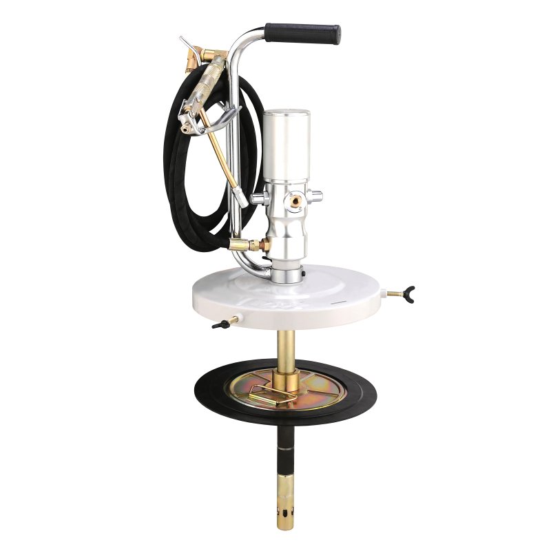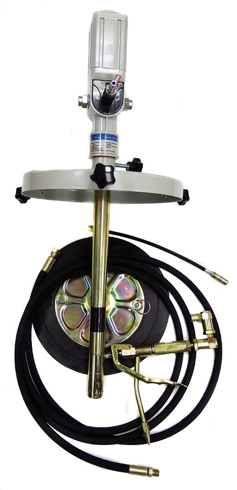 Солидолонагнетатель пневматический, мобильный, для густой смазки. Комплект оснащен: пневматический насос для смазки 50:1 производительностью 800гр/мин, мембрана и крышка для солидолонагнетателя, шланг 4 м, раздаточный пистолет с наконечником и ручка для бочек 20-60 кг. При давлении воздуха 6-8 Атм давление смазки 400 Атм максимально. Масса: 9 кг.