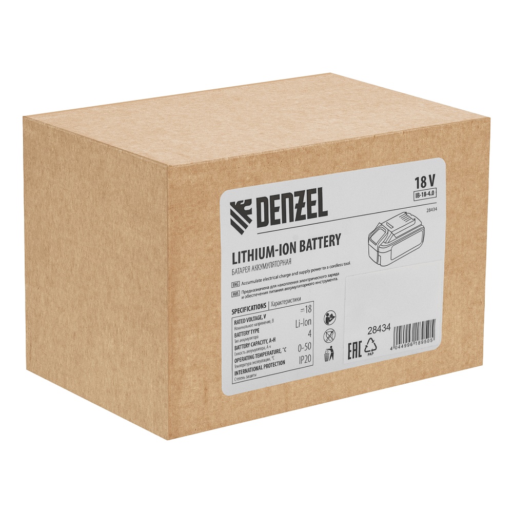<p>Универсальный литий-ионный аккумулятор Denzel IB-18-4,0 28434 подходит для любой модели инструмента из линейки Denzel IB и всех соответствующих зарядных устройств. Повышенная емкость 4 Ач обеспечивает решение большего объема задач на одном заряде, что значительно экономит рабочее время.</p><h2>Преимущества</h2><ul><li>Отсутствие эффекта памяти — Li-Ion аккумулятор защищен от потери емкости и гарантирует превосходные технические характеристики инструмента на протяжении всего срока службы.</li><li>Защита от перегрузок и короткого замыкания — аккумулятор моментально отключается при превышении допустимого значения по току.</li><li>Защита от перезаряда и глубокого разряда — встроенный автоматический контроллер предотвращает необратимые процессы и выход аккумулятора из строя. </li><li>Термозащита — АКБ автоматически отключается в случае перегрева до полного остывания.</li><li>LED-индикация уровня заряда — мастеру удобно отслеживать, на какое время работы рассчитывать.</li></ul>