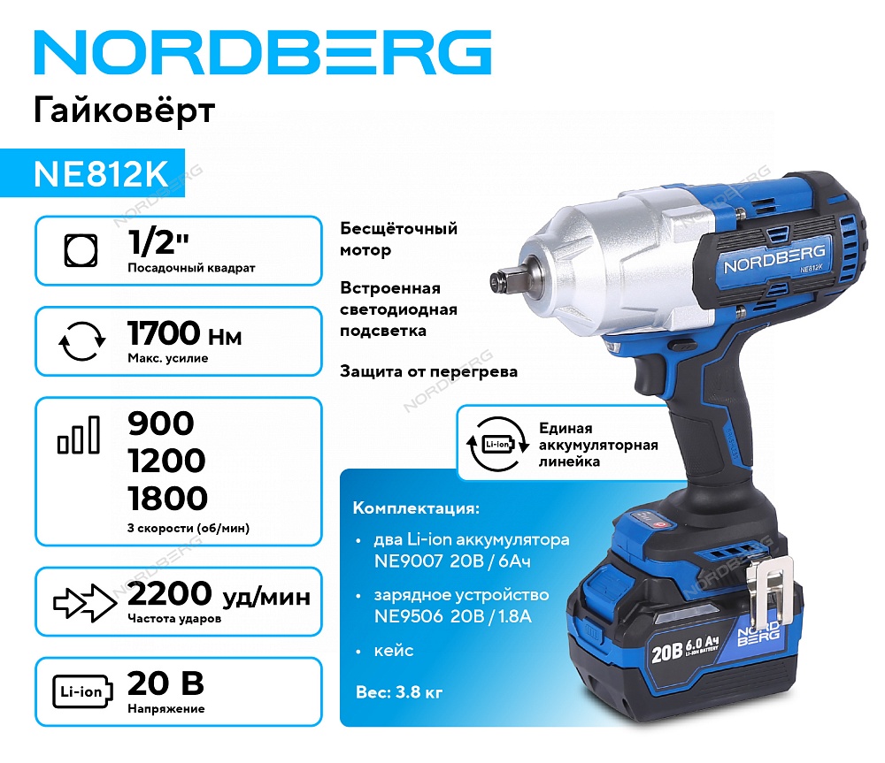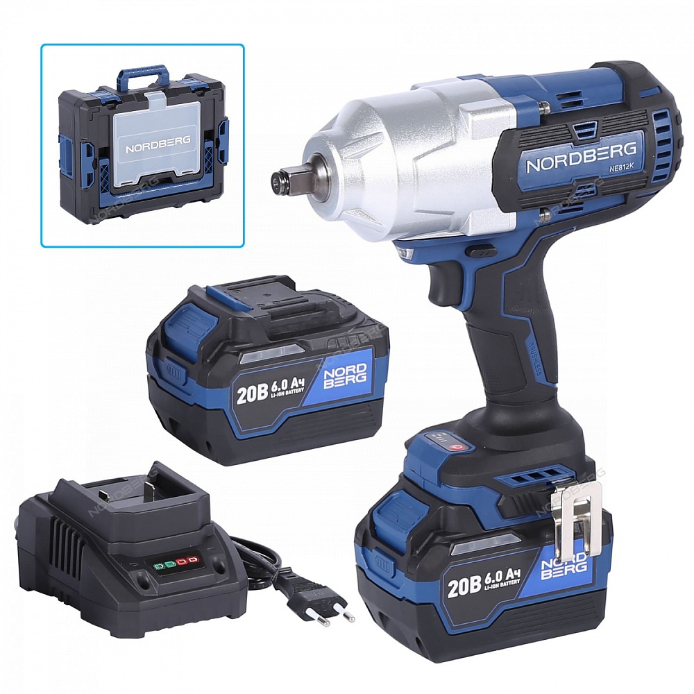 Гайковерт аккумуляторный, 1/2", 21 В, 1700 Нм, 2 аккумулятора 6A и зарядное устройство, в кейсе NORDBERG NE812K купить в Екатеринбурге цена ✅ - Все для СТО