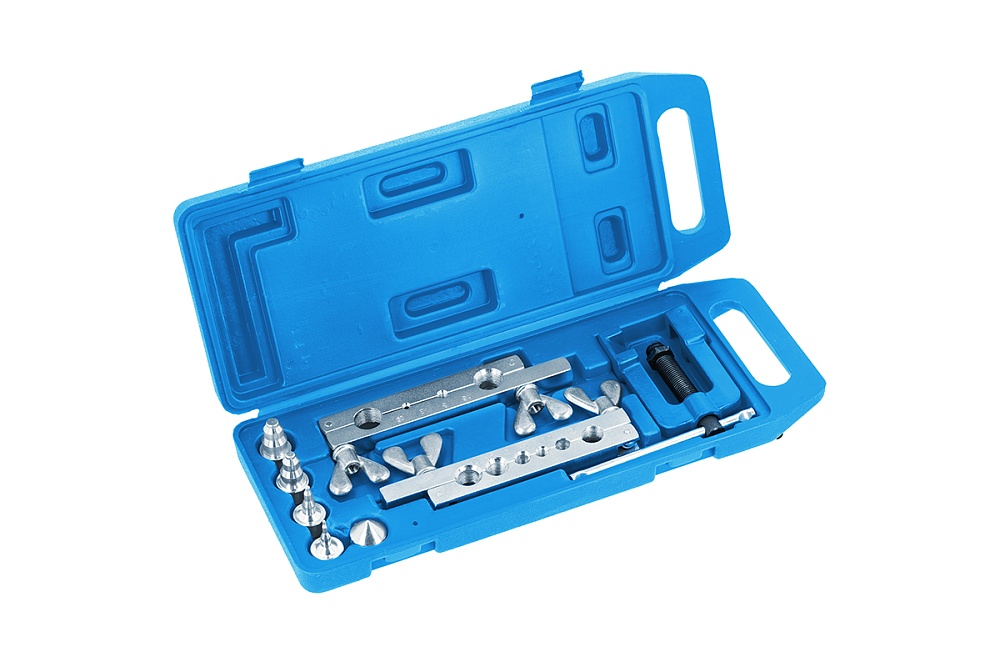 Набор для ручного расширения и развальцовки труб из стали, цветных металлов, алюминия и пластмасс. Для изготовления конических соединительных фланцев под углом 90°. Комплект предназначен для проведения монтажных, автомобильных и строительных работ.