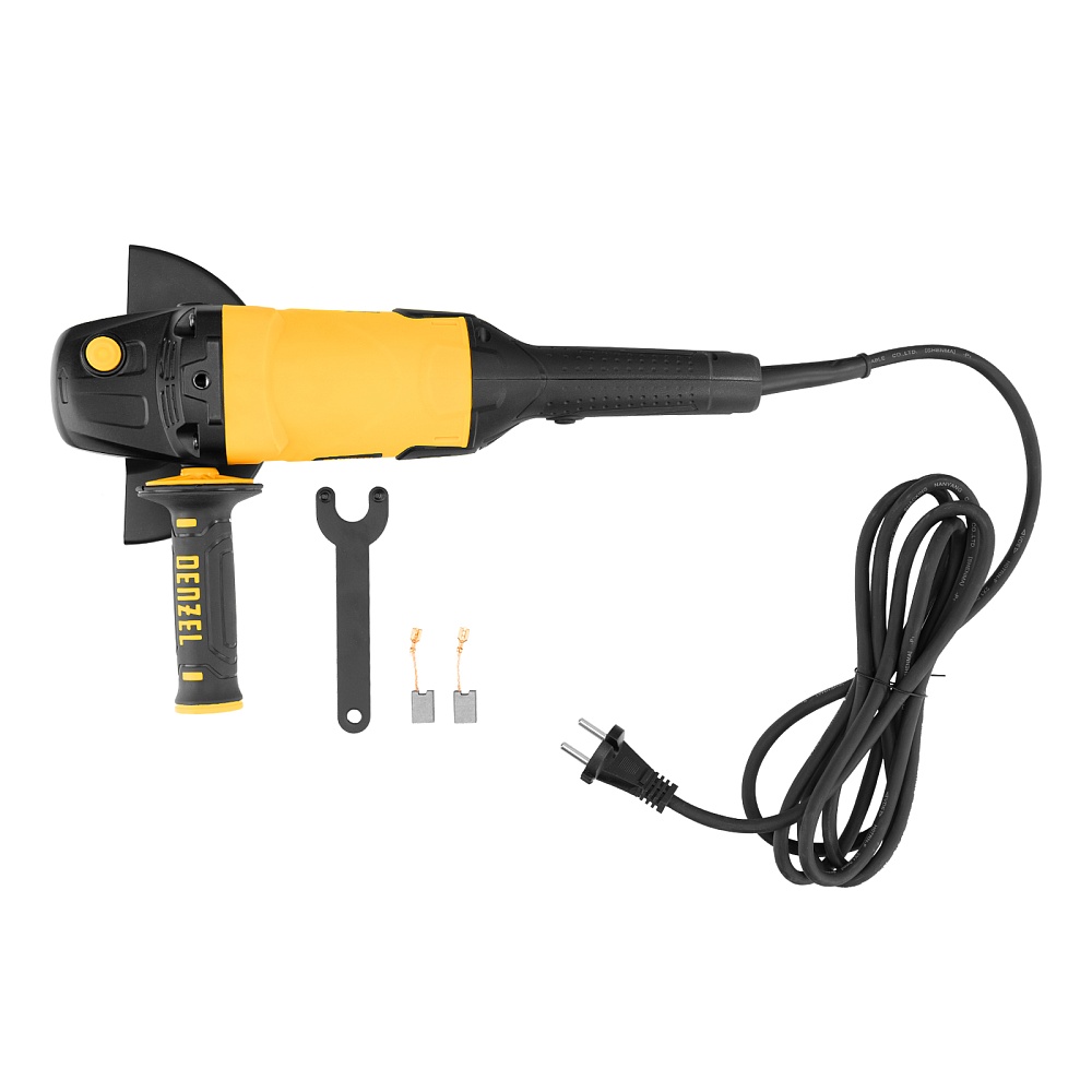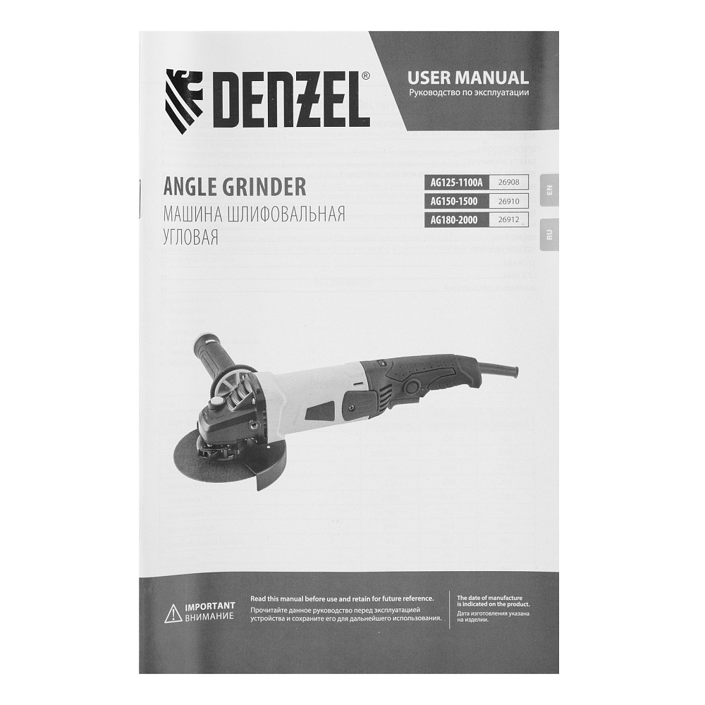 <p>Угловая шлифовальная машина Denzel AG150-1500 26910 мощностью 1500 Вт совместима с насадками максимальным диаметром 150 мм, поддерживает частоту вращения шпинделя 8500 об/мин, благодаря чему эффективно справляется с обработкой и зачисткой поверхностей, а также резкой, шлифовкой металла толщиной до 50 мм и камня. Пригодится дома, в гараже и на даче.</p><h2>Преимущества</h2><ul><li>Высокий ресурс — усиленная пылезащита обеспечивает 450 часов работы даже при резке камня или бетона.</li><li>Безопасность — кнопка блокировки предотвращает случайный запуск УШМ.</li><li>Надежность — усовершенствованная конструкция щеточного узла обеспечивает стабильную работу двигателя.</li><li>Быстрая подготовка к работе — для установки защитного кожуха на УШМ не требуются дополнительные инструменты.</li><li>Удобное обслуживание — в комплект входят специальный ключ и запасные угольные щетки.</li><li>Мобильность — кабель длиной 3 м позволяет увеличить рабочую зону.</li><li>Эргономичность — боковую рукоятку можно установить в 1 из 3 положений: слева, справа или сверху.</li><li>Комфортная работа — прорезиненная рукоятка удобно лежит в руке и не выскальзывает из ладони.</li><li>Гарантия 3 года — качество шлифовальной машинки подтверждено производителем.</li></ul>