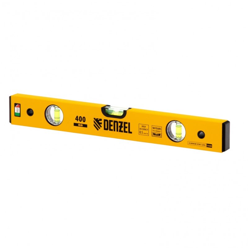 <p>Алюминиевый фрезерованный уровень Denzel 33680 длиной 400 мм, с 3 глазками, используется для контроля вертикальных и горизонтальных плоскостей. Позволяет получить качественный результат при выполнении строительных и отделочных работ.</p><h2>Преимущества</h2><ul><li>Надежность и долговечность — инструмент изготовлен из алюминиевого профиля.</li><li>Ударопрочность — ампулы имеют прочные стенки из поликарбоната.</li><li>Невысокая погрешность 0,5 мм/м — базовая поверхность фрезерована.</li><li>Высокое качество — пузырьковые ампулы установлены с использованием электронного контроля точности.</li></ul><p>Для определения отклонения вертикали 90° необходимо использовать пузырьковую ампулу только в верхнем положении уровня. Только базовая поверхность (противоположная ампуле 180°) является рабочей.</p>