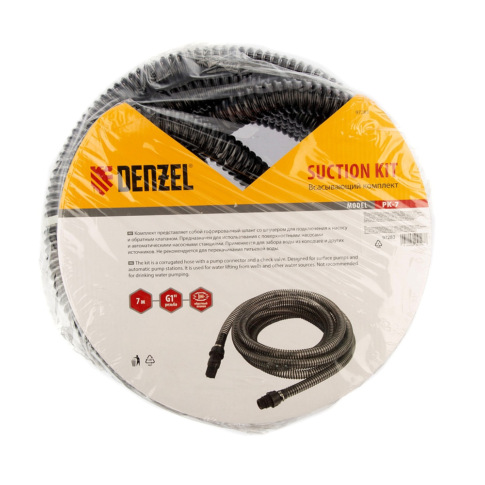 <p>Всасывающий комплект Denzel РК 7 97283 с присоединительным диаметром 1 дюйм, со шлангом длиной 7 м м обратным клапаном, используется с поверхностными насосами и автоматическими насосными станциям Denzel. Благодаря встроенному фильтру, очищающему поступающую воду, ее можно набирать не только из искусственных резервуаров, но и из естественных водоемов.</p><h2>Преимущества</h2><ul><li>Прочность и долговечность — гофрированный шланг из высококачественного ПВХ устойчив к излому и разрыву.</li><li>Длина шланга 7 м — можно набирать воду с большой глубины.</li><li>Эффективная работа — встроенный обратный клапан не допускает оттока воды.</li><li>Полная комплектация — коннектор и штуцер для подключения есть в комплекте, поэтому их не нужно покупать отдельно.</li></ul>