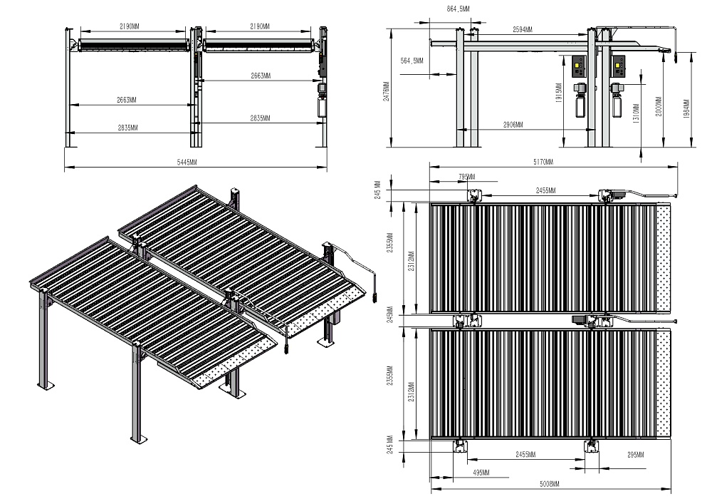 Конструкция подъёмника выполнена по классической четырёхстоечной схеме, что обеспечивает высокую устойчивость и равномерное распределение нагрузки. Подъём осуществляется плавно и контролируемо, без перекосов, что особенно важно при длительном хранении автомобиля на высоте.