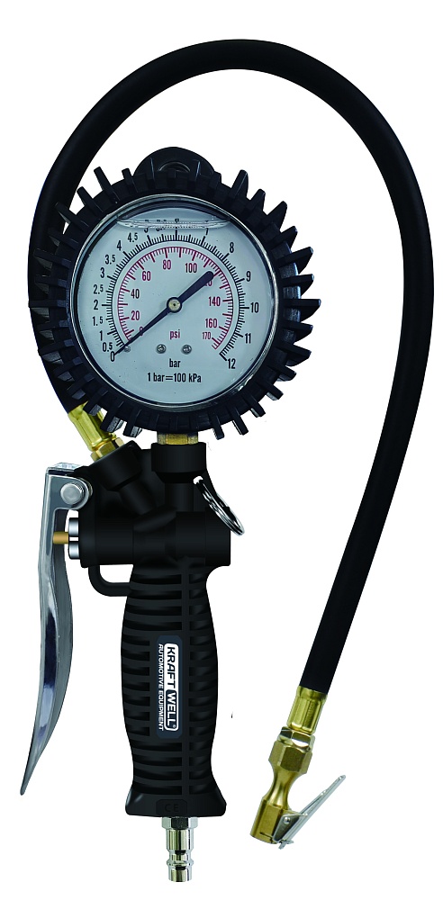 KRWTG-A4 KraftWell Пистолет для подкачки шин. В цветной коробке. Аналоговый жидкостный манометр. Пластиковая рукоятка, металлический курок. Давление до 12 бар.