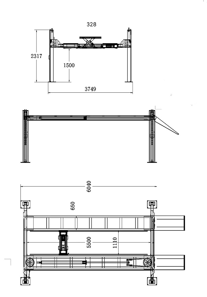KRW8FPL KraftWell Подъемник четырехстоечный, электрогидравлический, г/п 8 000 кг., 3 кВт, высота подъема 1500 мм., размеры платформ 5500х650 мм, платформы - гладкие. В комплекте с пневматичекой траверсой г/п 5 000 кг.