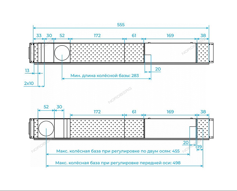 - При установке удлинительных платформ 01-00002788 длина рабочей поверхности увеличивается на 63 см и составляет 618 см. Это позволяет работать с транспортом с увеличенной базой и удлинённым кузовом;