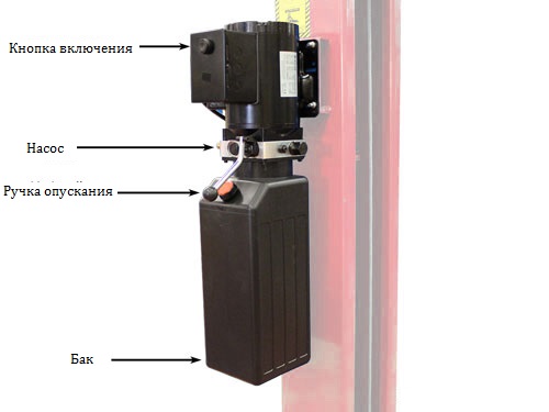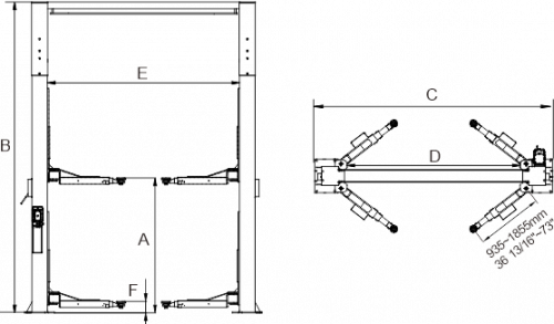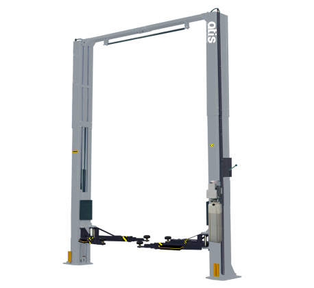 Подъемник двухстоечный электрогидравлический с управлением стопорами на одной колонне, асимметричный, двухцилиндровый, г/п 4000 кг., 2,2 кВт, высота подъема 1800 мм., расстояние между стойками 2680 мм., с нижней синхронизацией.