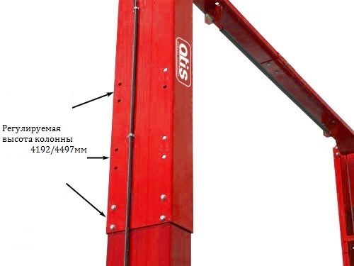 Электрогидравлический 2-х стоечный автомобильный подъёмник с верхней синхронизацией и разблокировкой рычагом на одной колонне, грузоподъемностью 4,5 тонны.