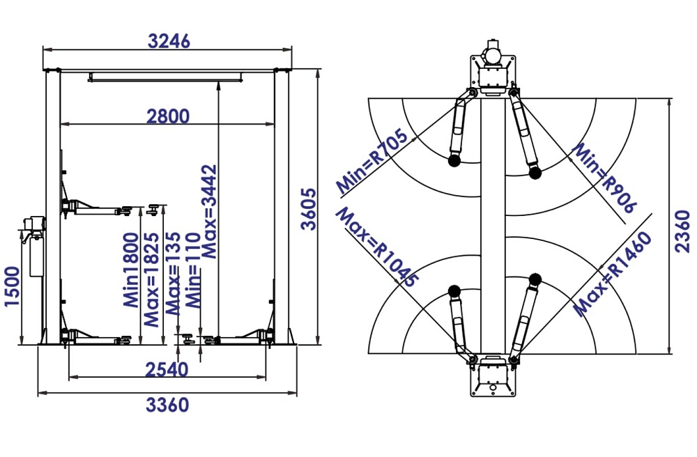Двухстоечный электрогидравлический подъемник с верхней синхр. Грузоподъемность 4.0 т, высота колонны 3602мм, механическое управление стопорами на одной колонне.
