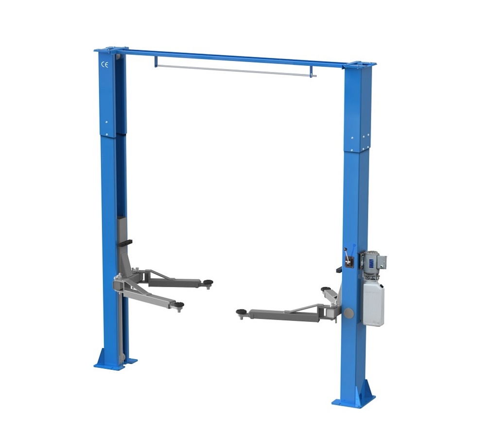 Электрогидравлический 2-х стоечный автомобильный подъёмник с верхней синхронизацией и разблокировкой рычагом на одной колонне, грузоподъемностью 4,5 тонны.