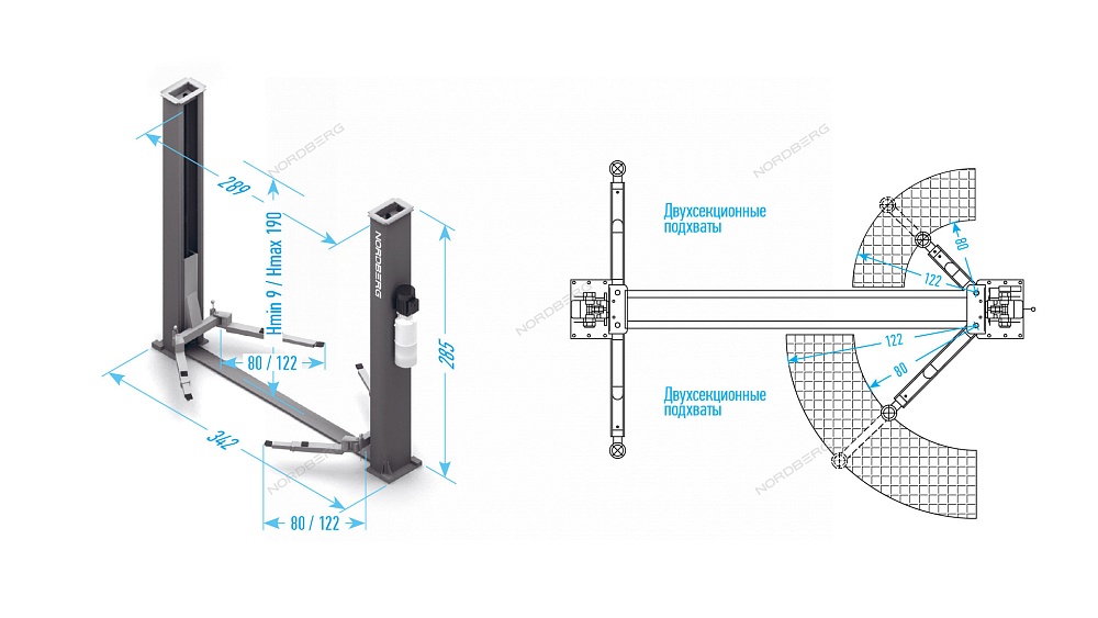 Подъемник 380V 2х стоечный 4т, со снятием стопоров с одной колонны (синий) NORDBERG N4120BM-4B