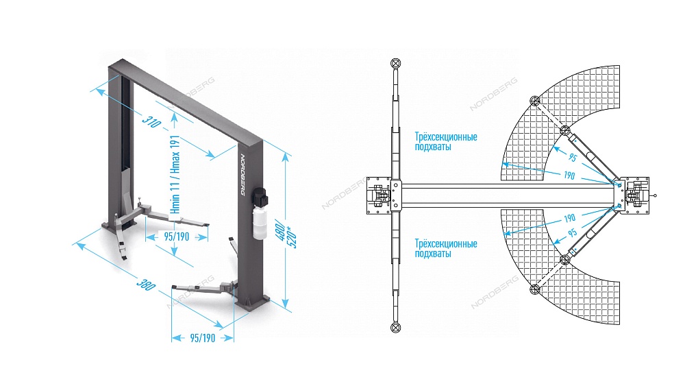Подъемник 380V 2х стоечный 6т с верхней синхронизацией (синий) LONG NORDBERG N4122H1E-6B купить в Екатеринбурге цена ✅ - Все для СТО
