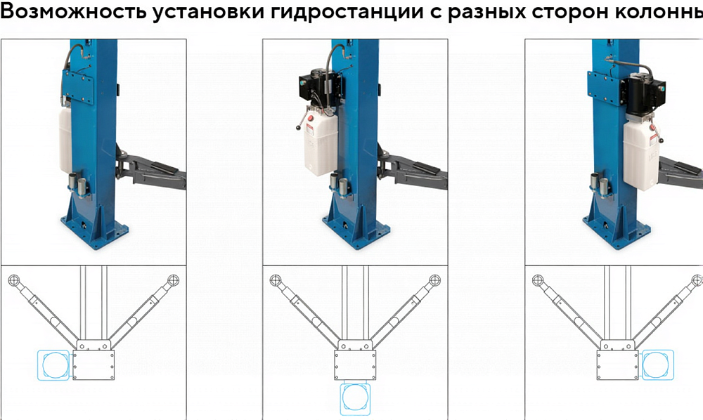 Конструкция двухстоечного подъемника APO-40C_380 позволяет установить гидростанцию на боковой или передней поверхности колонны.