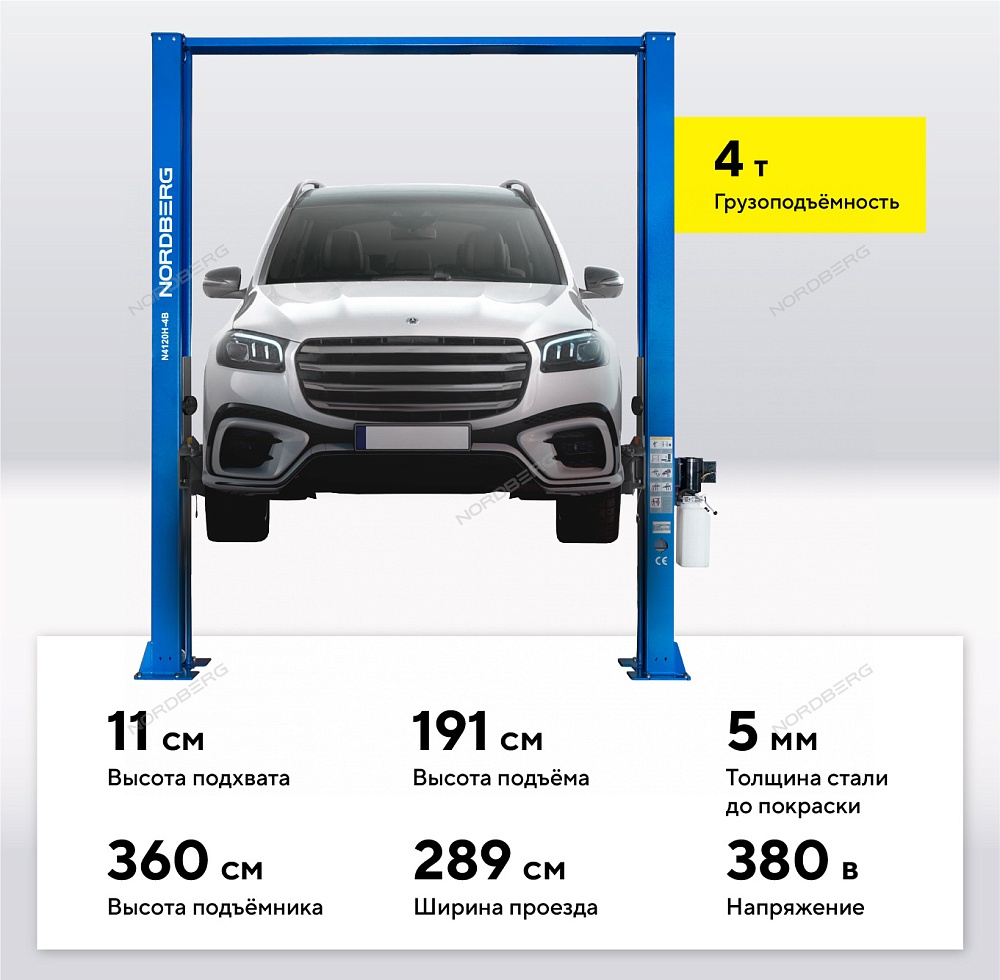 Подъемник двухстоечный 4 т, верхняя синхронизация, H=3,6 м, 380 В, синий NORDBERG N4120H-4B_3+2_380 купить в Екатеринбурге цена ✅ - Все для СТО