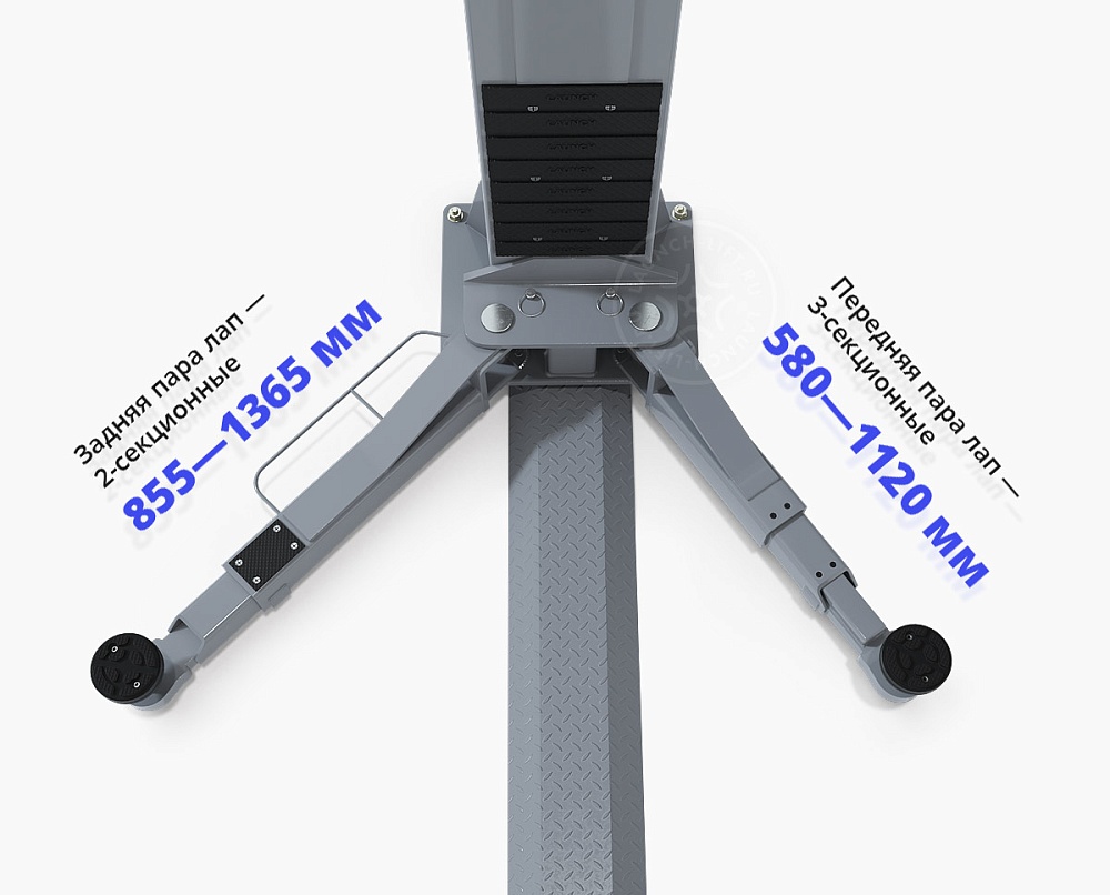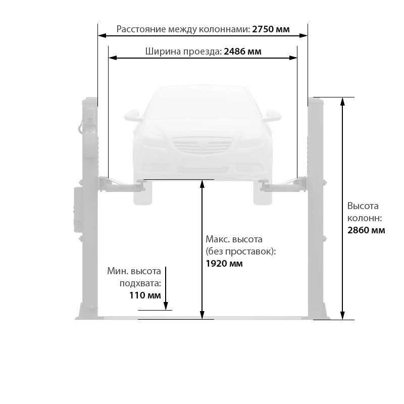 Управление стопорами с одной колонны при помощи автоматизированного пульта управления. Расположение гидростанции в верхней части колонны. Универсальные лапы подхвата  (длина передних – до 1120 мм, задних - 1365 мм). Двойной защитный трап. Усиленная конструкция элементов подъемника, шкивы увеличенного диаметра. Толщина металла профиля стойки – 5 мм. Элементы защиты в базовом комплекте поставки (гидравлические парашютные клапаны, защита движущихся механизмов, защитные рамки на лапах подхвата, резиновые накладки по всей высоте каретки). Высота подхвата от 110 мм. Максимальная высота подъема – до 1920 мм. Профессиональный Н-образный форм-фактор каретки.