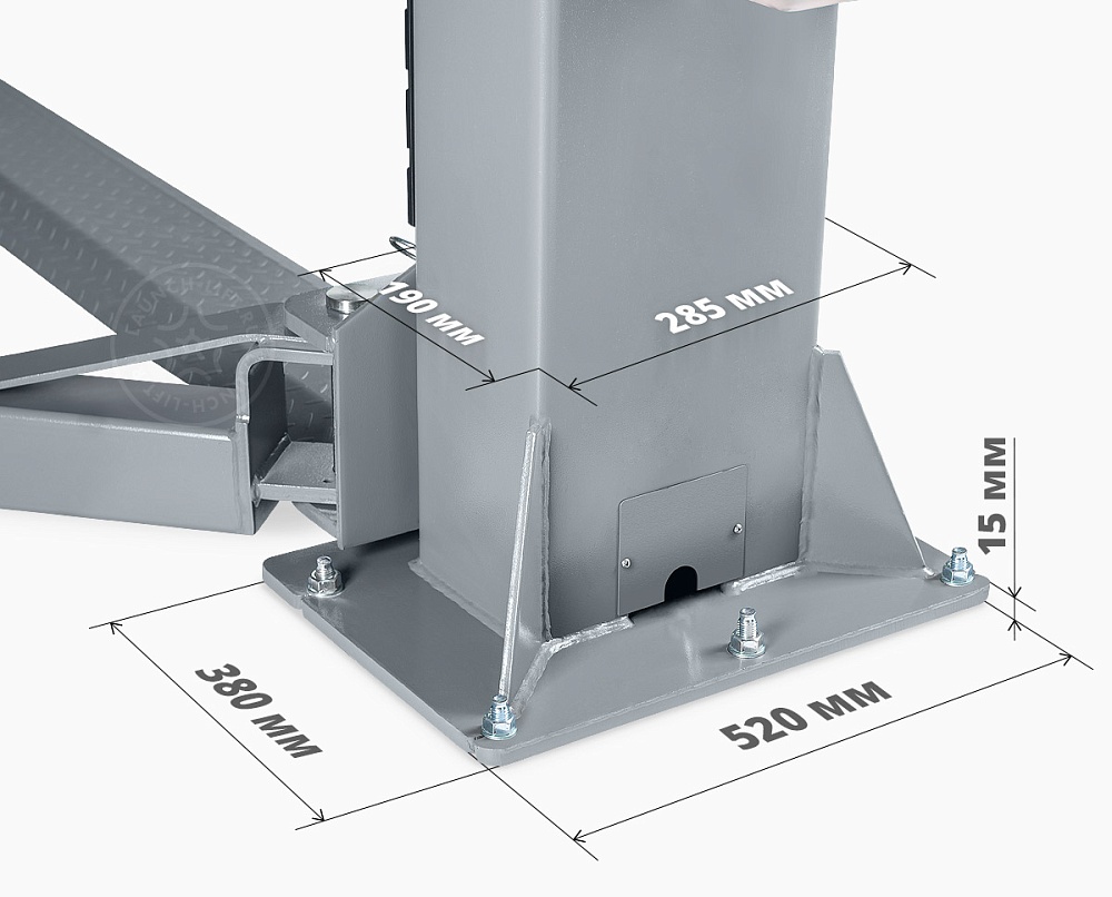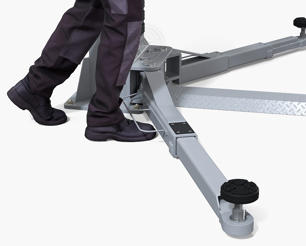 Двухстоечный электрогидравлический подъемник асимметричной конструкции с нижним типом синхронизации. Снятие с замков безопасности электрическое, кнопкой с пульта.