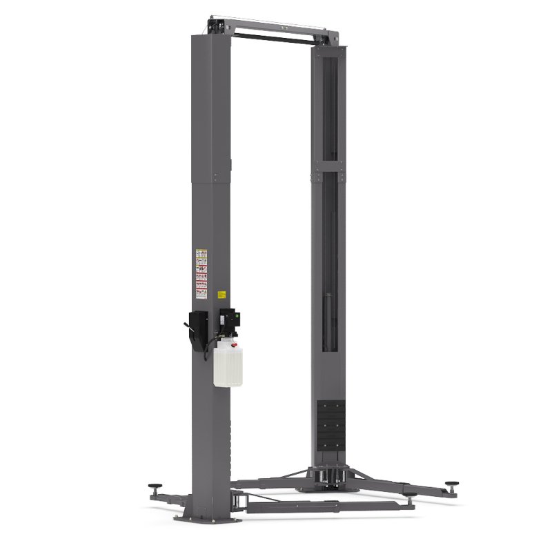Подъемник двухстоечный электрогидравлический, асимметричные каретки, цилиндры прямого действия, г/п 4200 кг., 2,2 кВт, высота подъема 1910 мм., расстояние между стойками 2840 мм., с верхней синхронизацией стальным тросом.