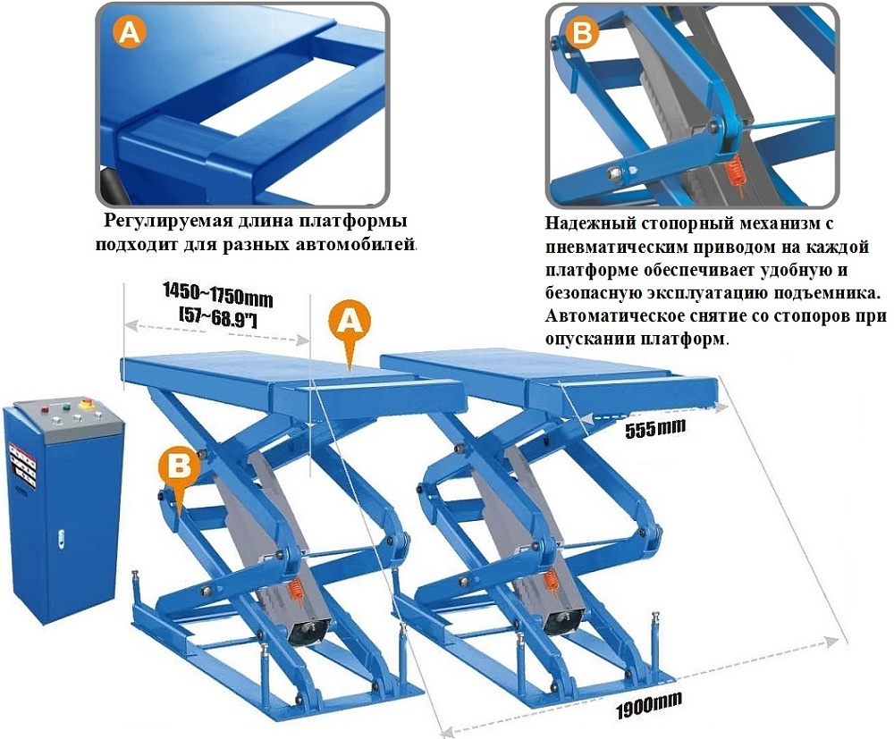 Подъемник оснащён пневматическим стопорным механизмом, требует подключения к пневмолинии. Раздвижные платформы увеличивают рабочую длину с 1550 до 1750 мм. Максимальная высота подъема — 2130 мм, высота от уровня пола — 1800 мм, заглубление — 330 мм. Расстояние между платформами — 780 мм. Стойка управления располагается отдельно, что упрощает размещение в помещении.