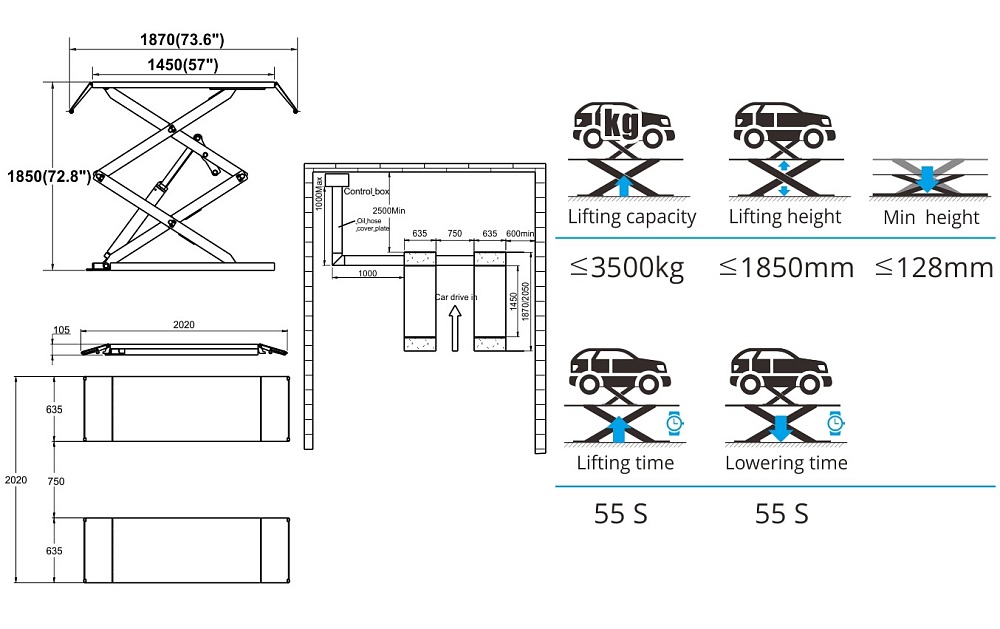 Поднимает от «Оки» до «Газели». г/п 3,0т. 220/380В. Установка на ровный пол. Высота подъёма 110-1850мм. Длина платформ 1450 мм. Подъём 4-мя гидроцилиндрами. Гарантия 24мес. Доставка РФ, РБ, Армения, Казахстан, Киргизия.
