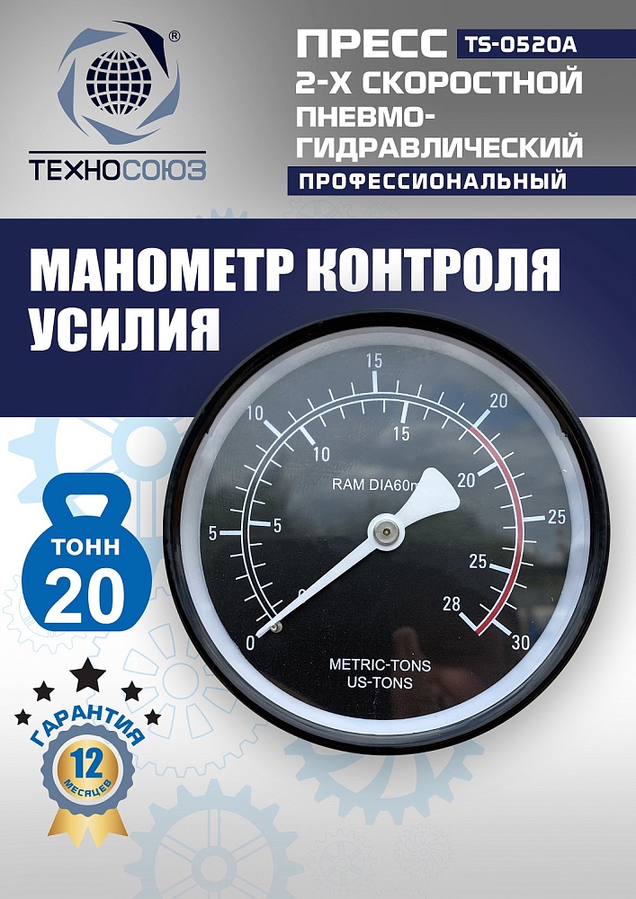 Пресс TS-0520A с усилием 20 тонн сочетает пневмогидравлический и ручной привод для универсальной работы в гаражах и СТО. Пневмопривод ускоряет выпрессовку неответственных деталей вроде втулок при потоке задач, а ручной насос обеспечивает точное дозирование усилия для подшипников.