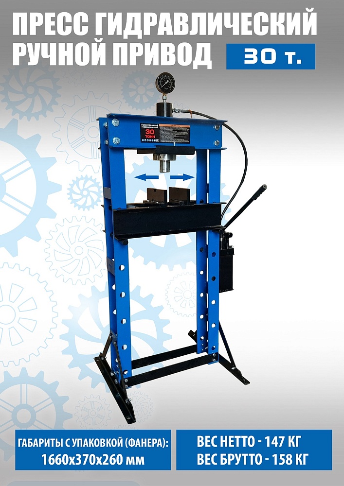 Пресс гидравлический ручной для автосервиса. Усилие 30 тонн. Насос — 2 плунжера. Ход поршня 160 мм. Рабочее окно 530х980 мм. Поршень приводится в действие нажатием на ручку. Гидроцилиндр передвигается по всей ширине рамы, с возможностью установки в любом месте. Рекомендуется для выпрессовки деталей машин в автосервисе.