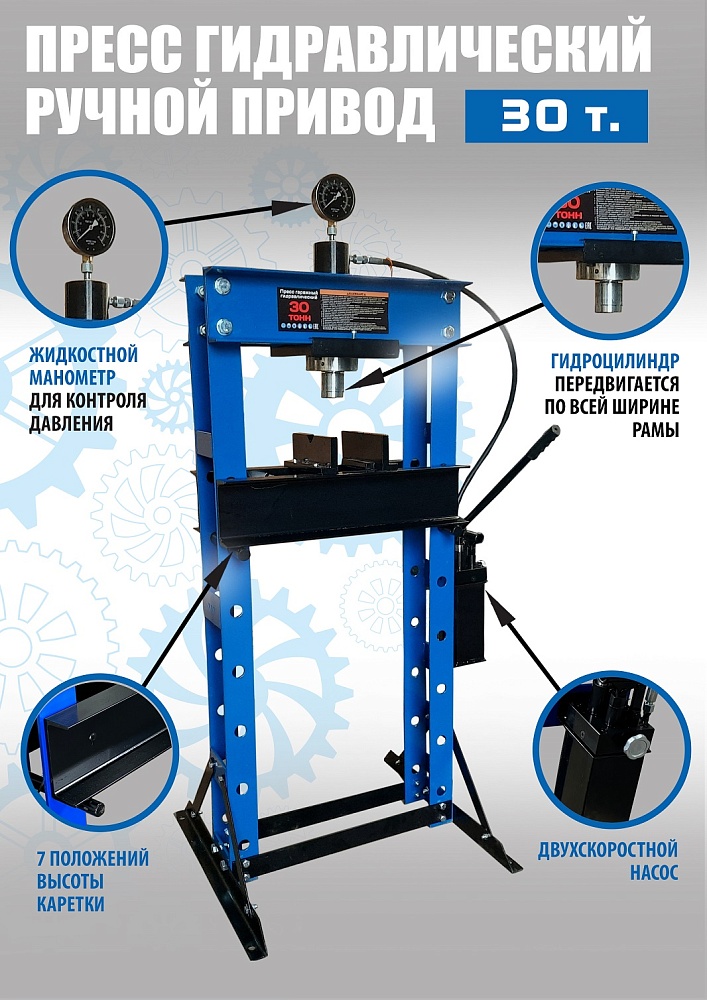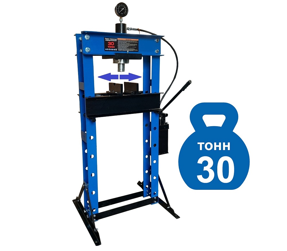 Пресс гидравлический, ручной усилие 30 тонны. Две скорости подачи пуансона.Первая скорость для быстрой подачи штока к рабочей поверхности, вторая (медленно) для выпрессовки. Применяется для запрессовки деталей машин и механизмов в гаражах, автосервисах и СТО. Гидроцилиндр передвигается по всей ширине рамы, с возможностью установки в любом месте.