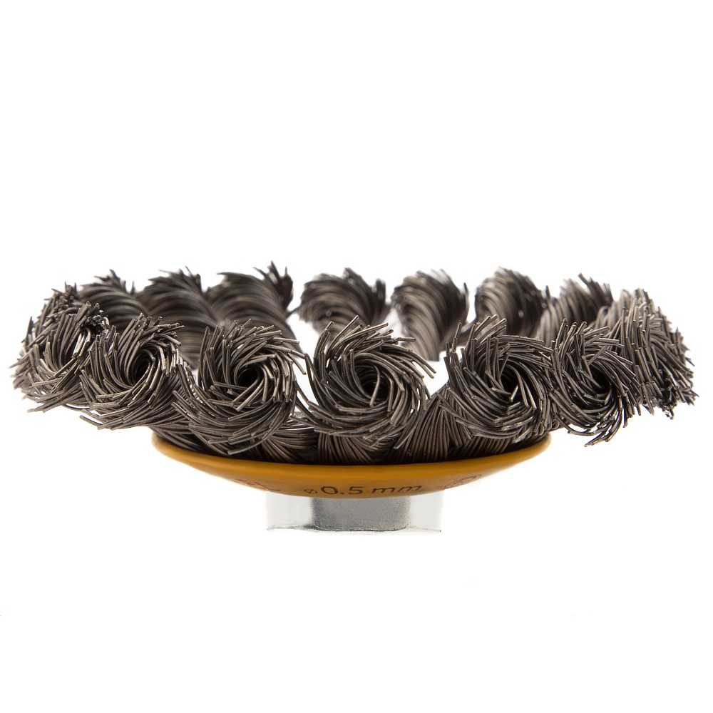 Щетка для УШМ, 100 мм, "Тарелка", крученая нержавеющая проволока 0.5 мм, М14 Denzel