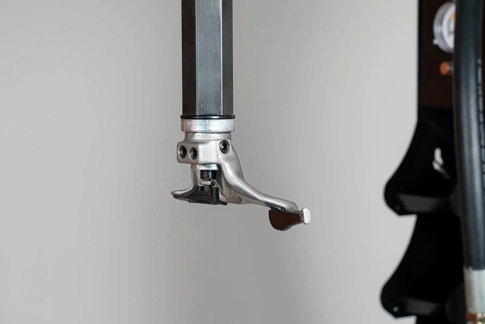 Манометр контроля давления воздуха смонтирован на монтажной стойке. Накачка - нажатием ногой на педаль.