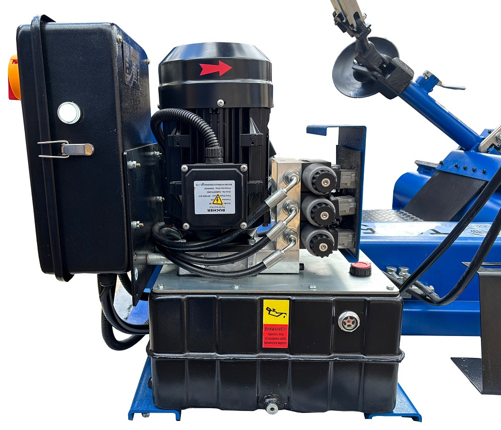 Моторы 2,2 + 2,2 кВт, 380В. В комплекте: Немецкий насос «Bucher hydraulics». Гарантия до 18 мес. Диски  с расширителями 14÷56”. Максимальное колесо Ø2300 мм, делает колеса "спарку" с шириной диска до 1050 мм. Вес колеса до 1600 кг. Отжим min-max. 2800-5265Н/м. Грузовой шиномонтажный станок для тракторов, сельхозтехники, еврофур и т.п.