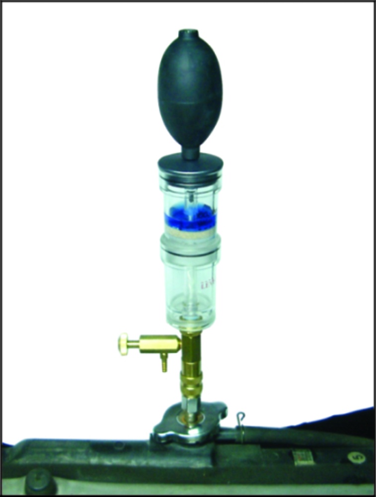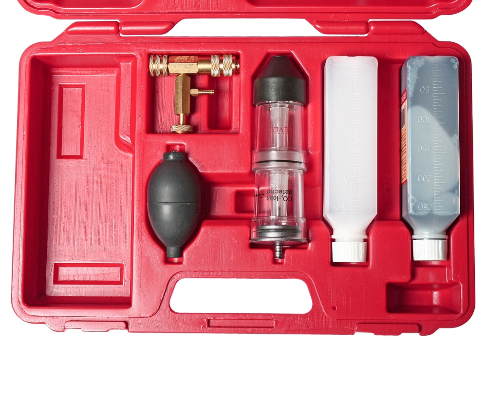 Набор представляет собой диагностическое устройство – тестер, с помощью которого можно определить содержания выхлопных газов в охлаждающей жидкости системы охлаждения двигателя автомобиля. Наличие выхлопных газов косвенно свидетельствует о проблемах, связанных с микротрещинами в камере сгорания, или неплотной прилегающей прокладке между блоком двигателя и ГБЦ и т.п., обычно возникающих после перегрева двигателя.