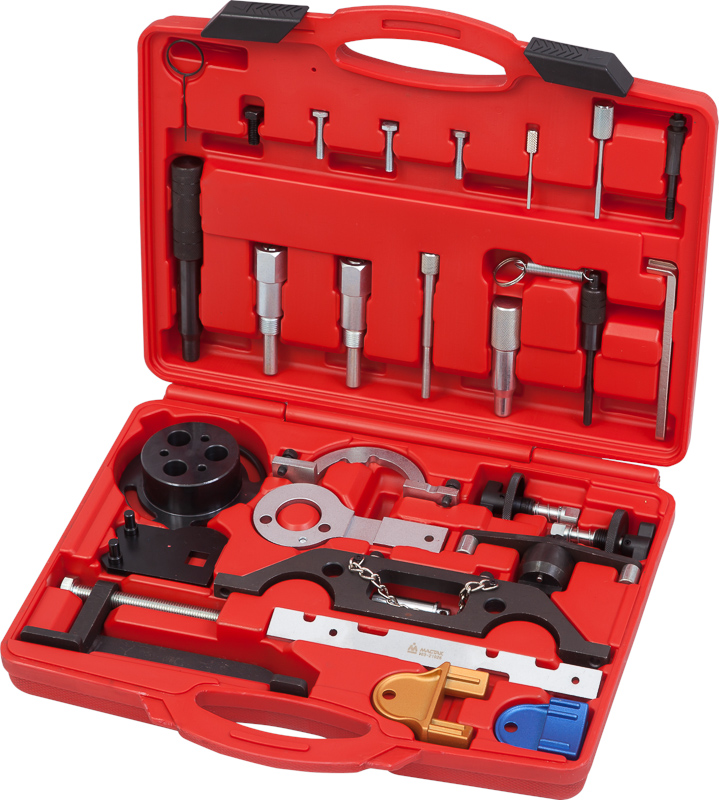 Набор включает все необходимые инструменты для профессионального ремонта двигателей Opel: фиксатор маховика, фиксатор коленчатого вала, фиксатор распределительного вала, фиксатор вала насоса высокого давления (применимо к дизельным моторам), съемник шкива коленвала, натяжитель ремня, а также подробные таблицы использования инструментов. Набор является полным функциональным аналогом оригинальных инструментов для Opel.