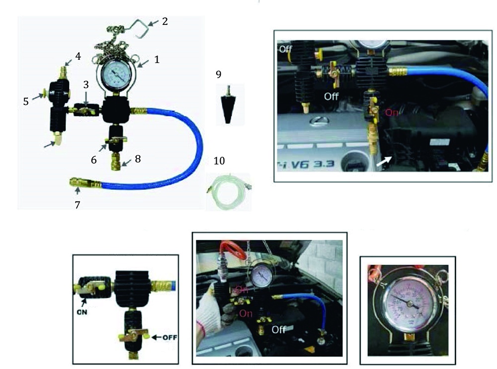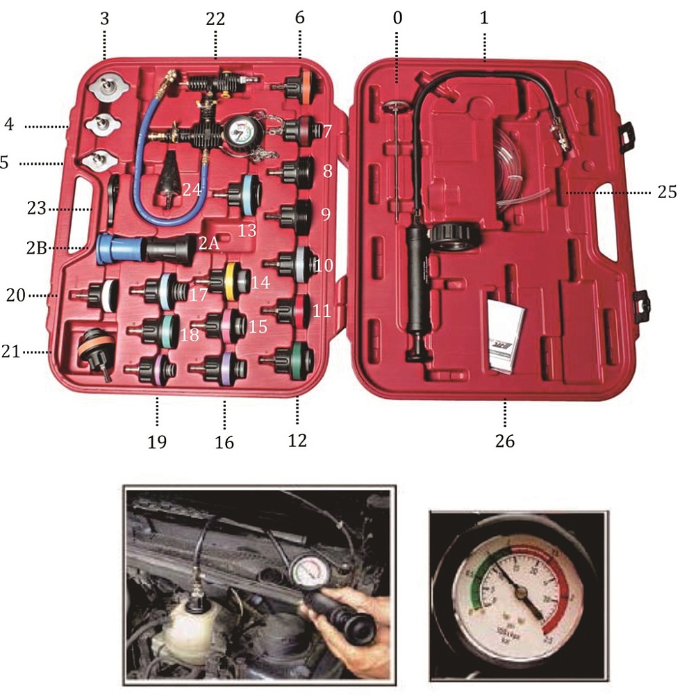 Принцип данного набора прост: с помощью ручного насоса, который имеет быстроразъёмное соединение с ниппелем сброса давления, подключается при помощи специальной радиаторной крышки из набора. После чего создают давление в системе охлаждения двигателя. Утечка, в случае если она находится в радиаторе, в патрубке или в другом месте, сразу даст о себе знать.