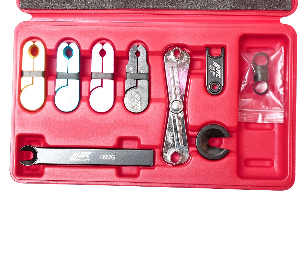 Набор съемников используется для демонтажа трубок топливной системы, системы кондиционирования, топливных шлангов, трубок подвода масла в АКПП и др.