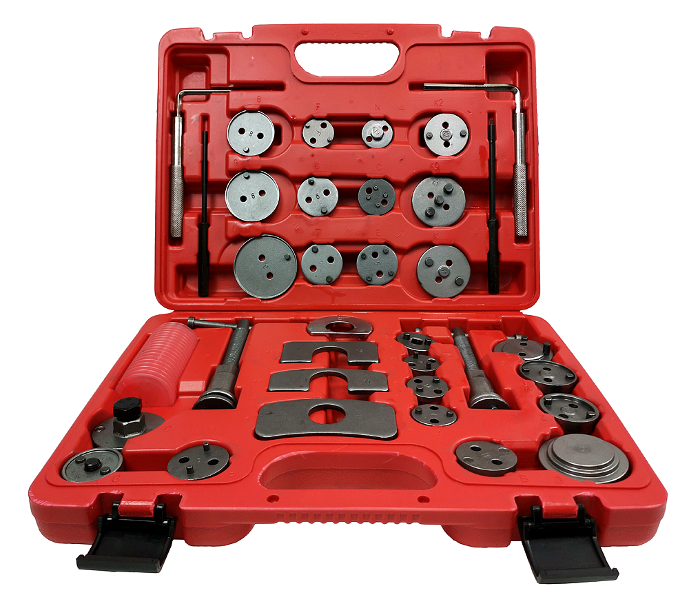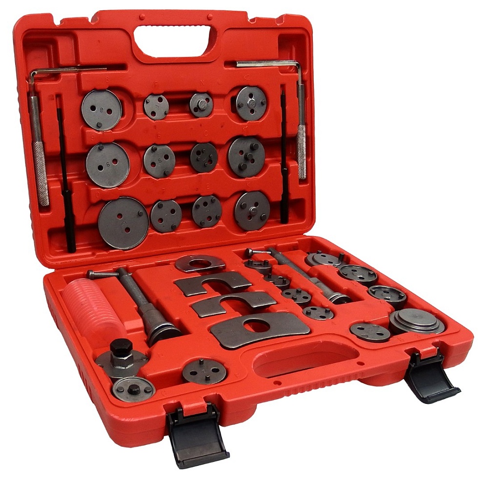два нажимных шпинделя (с правой и левой резьбой) для возврата поршней в тормозные цилиндры суппортов; 24 адаптера поршня; 6 мм и 7 мм шестигранные ключи суппорта; 3 мм и 5 мм бородки; 4 специальные пластины для фиксации положения резьбового шпинделя в суппорте; емкость с жировой смазкой.
