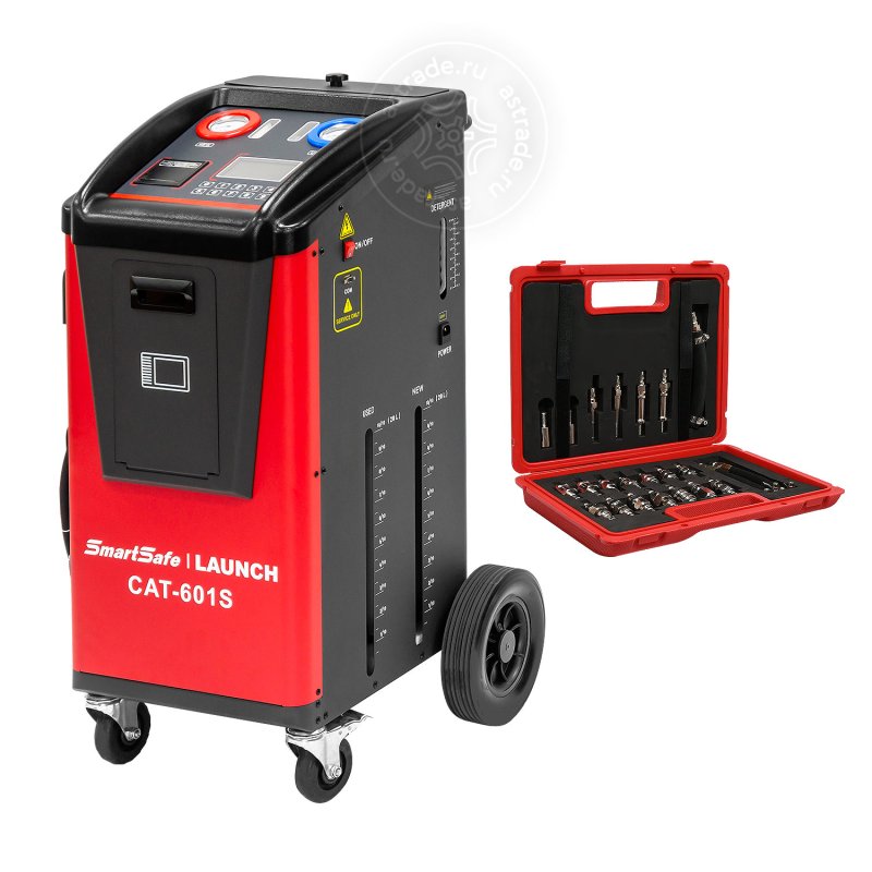 Launch CAT-601 S с базовыми адаптерами - установка для замены масла в АКПП. Стенд работает методом вытеснения старого масла новым, точно контролируя замену по весу. Имеет сменные фильтры, встроенную базу данных и опциональную интеграцию и диагностическим сканером для выполнения всех сервисных процедур.