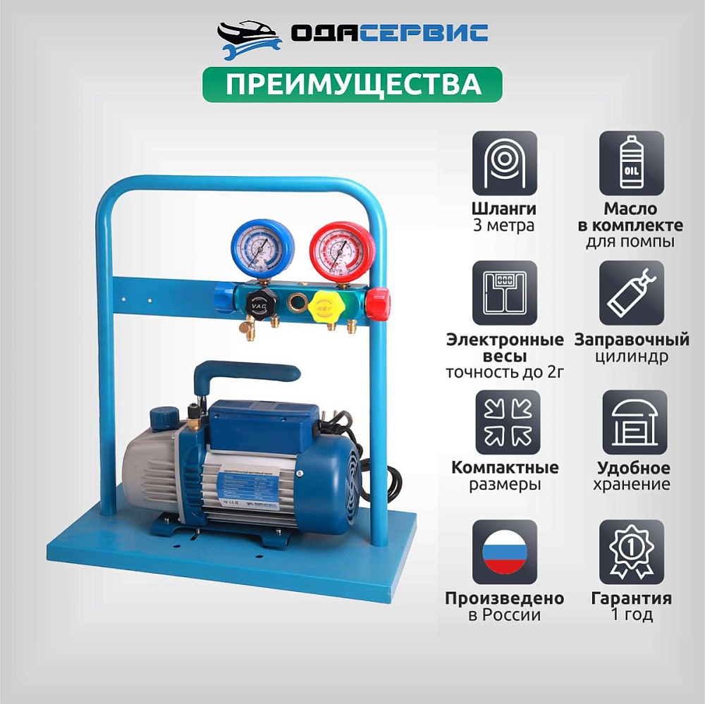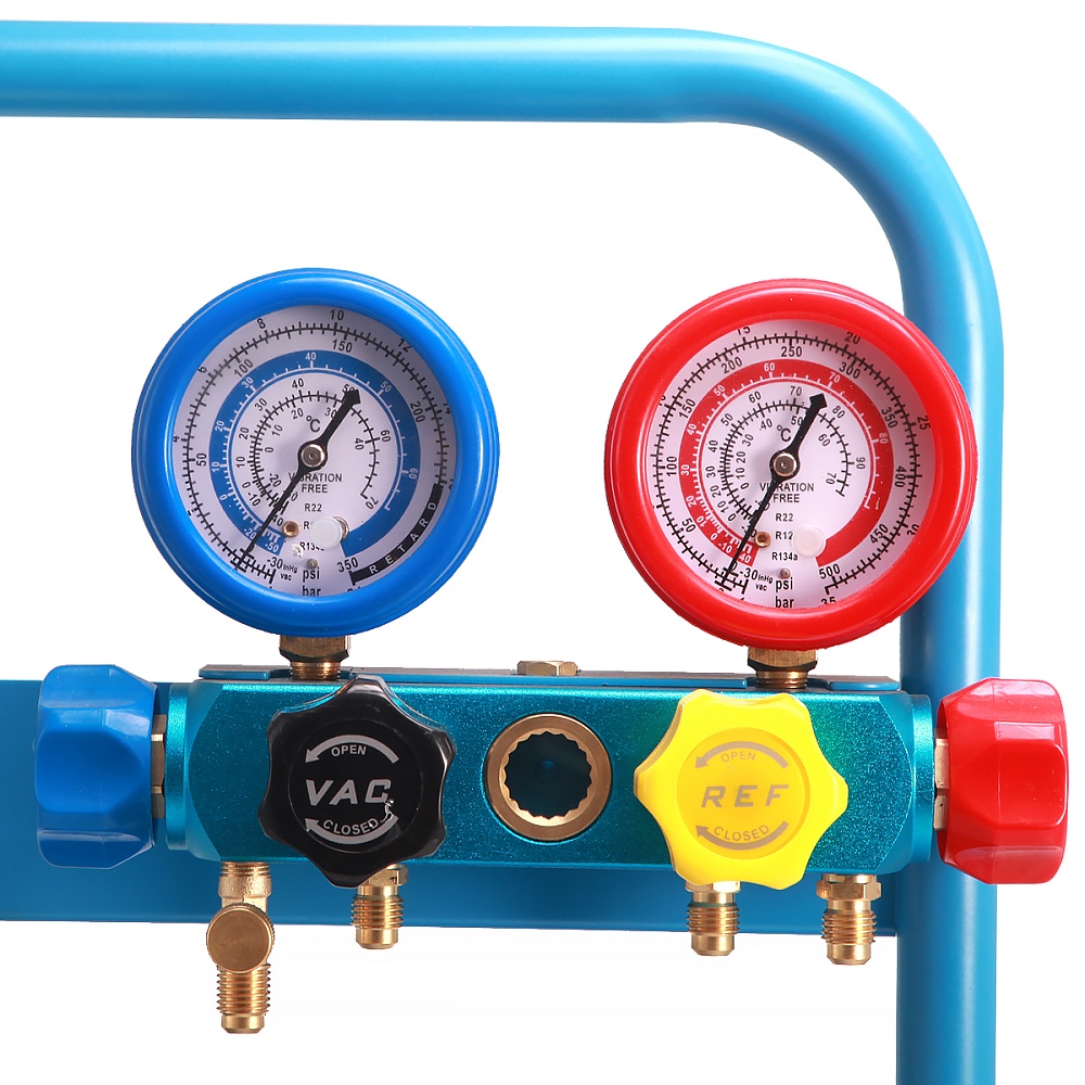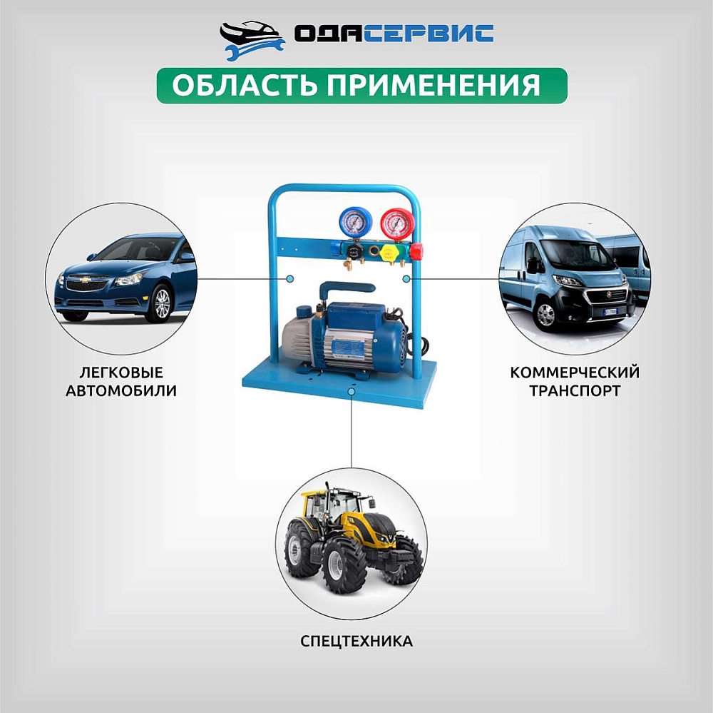 Ручная заправочная станция для кондиционеров способна диагностировать и заправлять автокондиционеры, климатические установки и другие системы, работающие на хладагенте R134A. Установка создана на базе 4-х вентильного коллектора и вакуумной помпы.