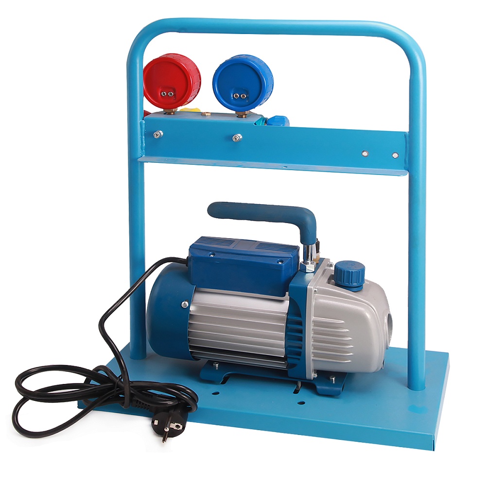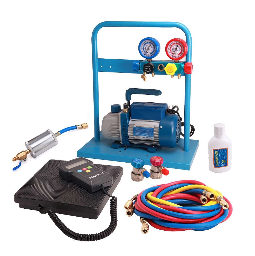 В зависимости от модели, установка комплектуется одноступенчатой или двухступенчатой вакуумной помпой с производительностью 60 л/мин. В комплект также входят 4 заправочных шланга различной длины ( 3м - 2шт., 1,5м - 1шт., 0.5м - 1 шт.). Для удобства транспортировки и хранения все компоненты установки установлены на металлической раме.