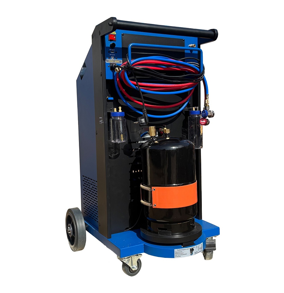 Автоматическая установка для обслуживания автомобильных систем кондиционирования с фреоном R-134a. Функции: откачивание и очистка хладагента из системы, отделение и последующий сброс масла, вакуумирование системы, автоматическая заправка фреона и масла.