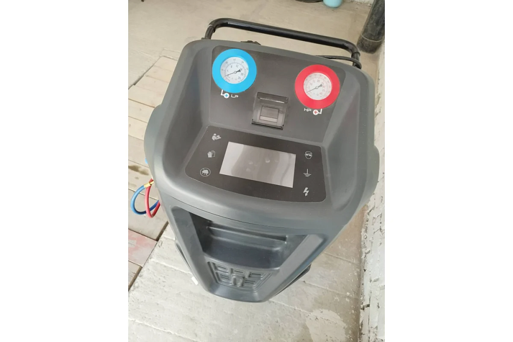Автоматическая установка для обслуживания автомобильных систем кондиционирования с фреоном R-134a. Функции: откачивание и очистка хладагента из системы, отделение и последующий сброс масла, вакуумирование системы, автоматическая заправка фреона и масла.