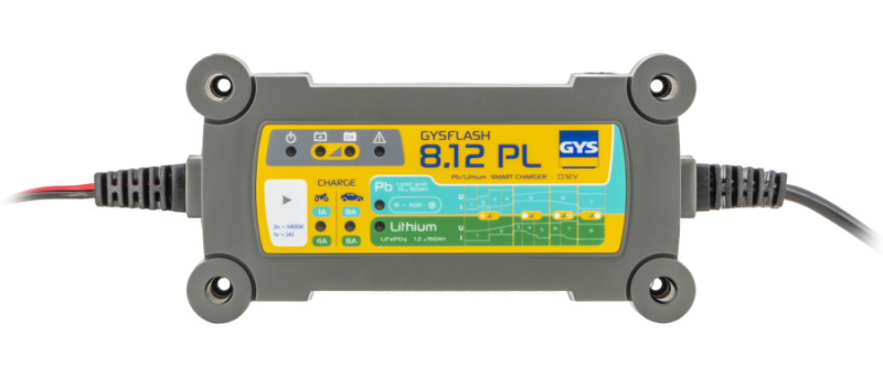 GYSFLASH 8.12 PL (8 A) — интеллектуальное зарядное устройство для 12-вольтовых аккумуляторов, рассчитанное на работу со свинцово-кислотными и литий-железо-фосфатными (LiFePO4) батареями. Подходит для автомобилей, фургонов и домов на колёсах, а также для сервисного и сезонного обслуживания АКБ.